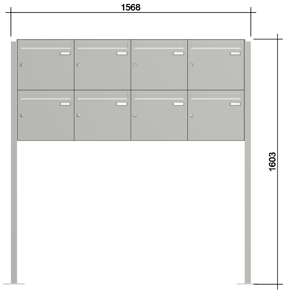 - ausgestattet mit Kunststoff-Namensschild und Edelstahl-verkapptem wasserdichtem Standardschloss mit zwei Schlüsseln; Blindkästen ebenfalls mit Standardschloss (wenn Blindfächer auf Grund der Kastenanzahl notwendig sind)