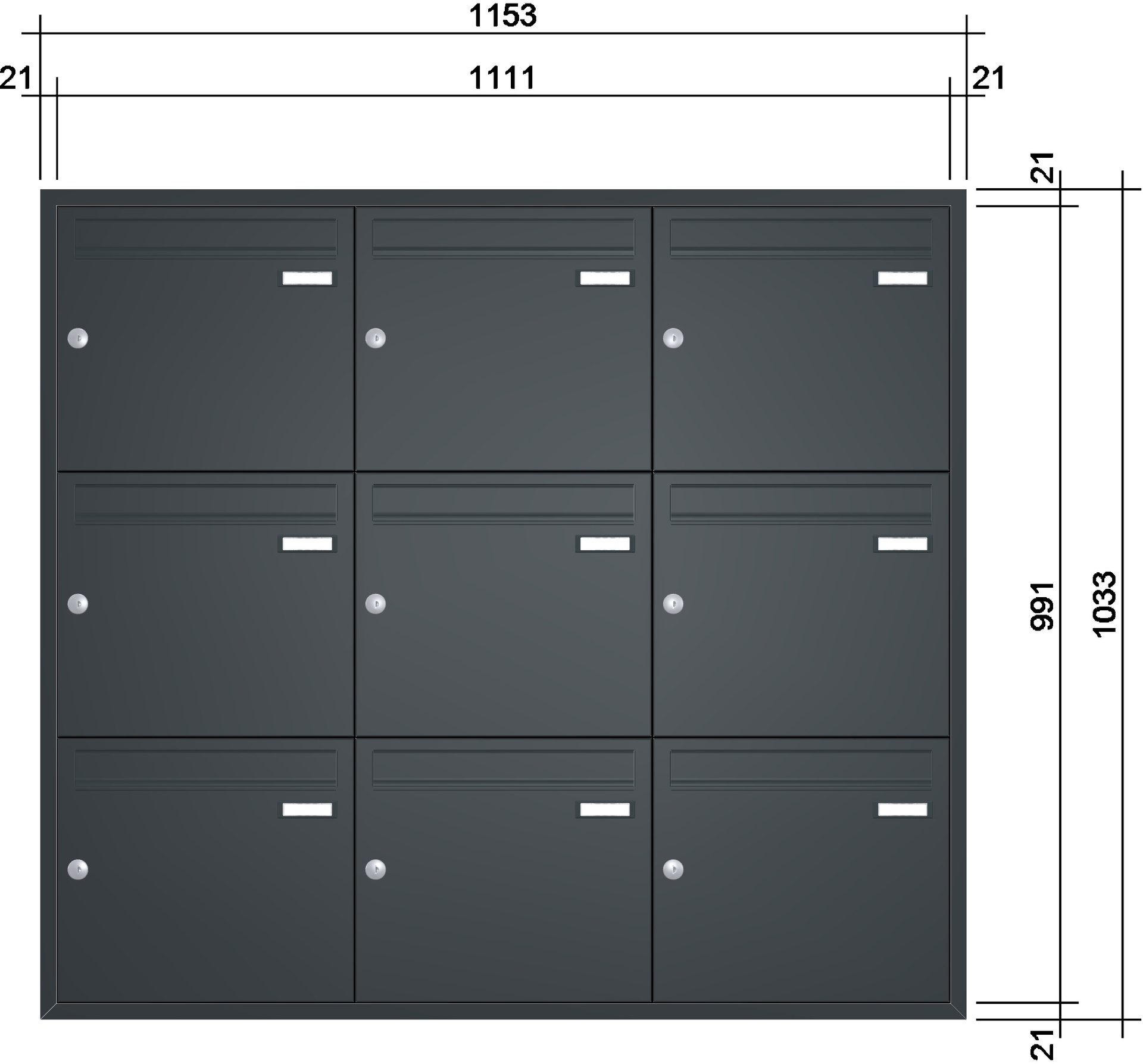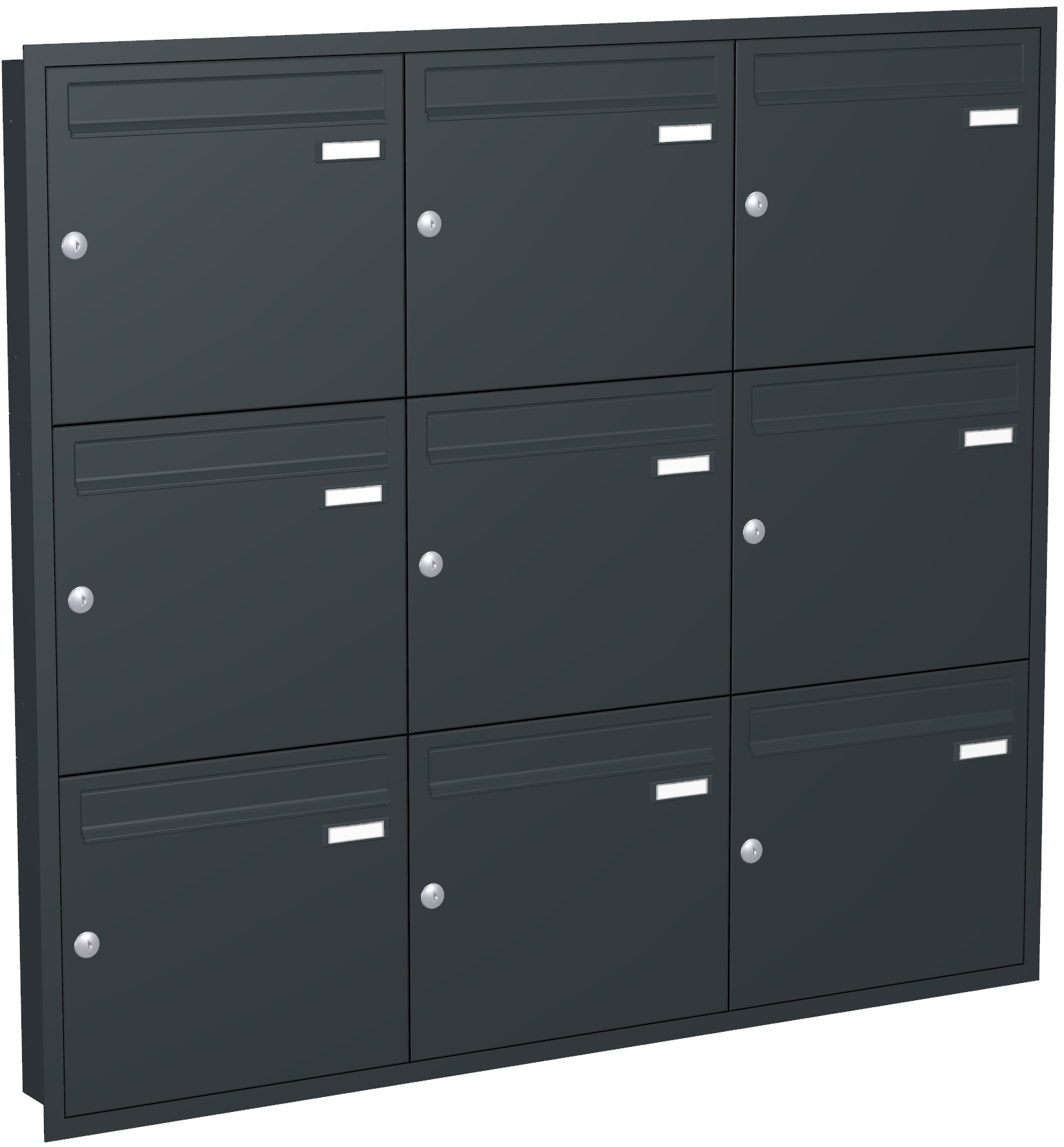 - ausgestattet mit Kunststoff-Namensschild und Eelstahl-verkapptem wasserdichtem Standardschloss mit zwei Schlüsseln; Blindkästen ebenfalls mit Standardschloss (wenn Blindfächer auf Grund der Kastenanzahl notwendig sind)
