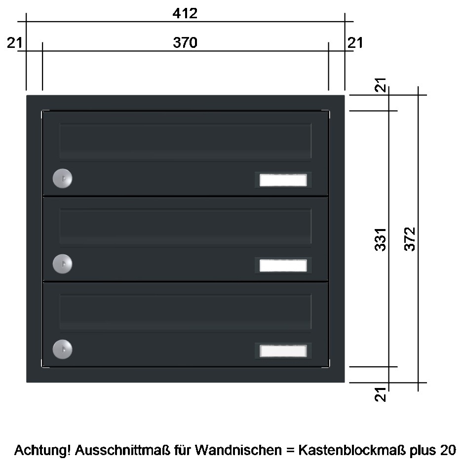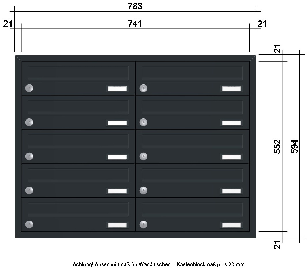 • ausgestattet mit Kunststoff-Namensschild und Edelstahl-verkapptem wasserdichtem Standardschloss mit zwei Schlüsseln; Blindkästen ebenfalls mit Standardschloss (wenn Blindfächer auf Grund der Kastenanzahl notwendig sind)