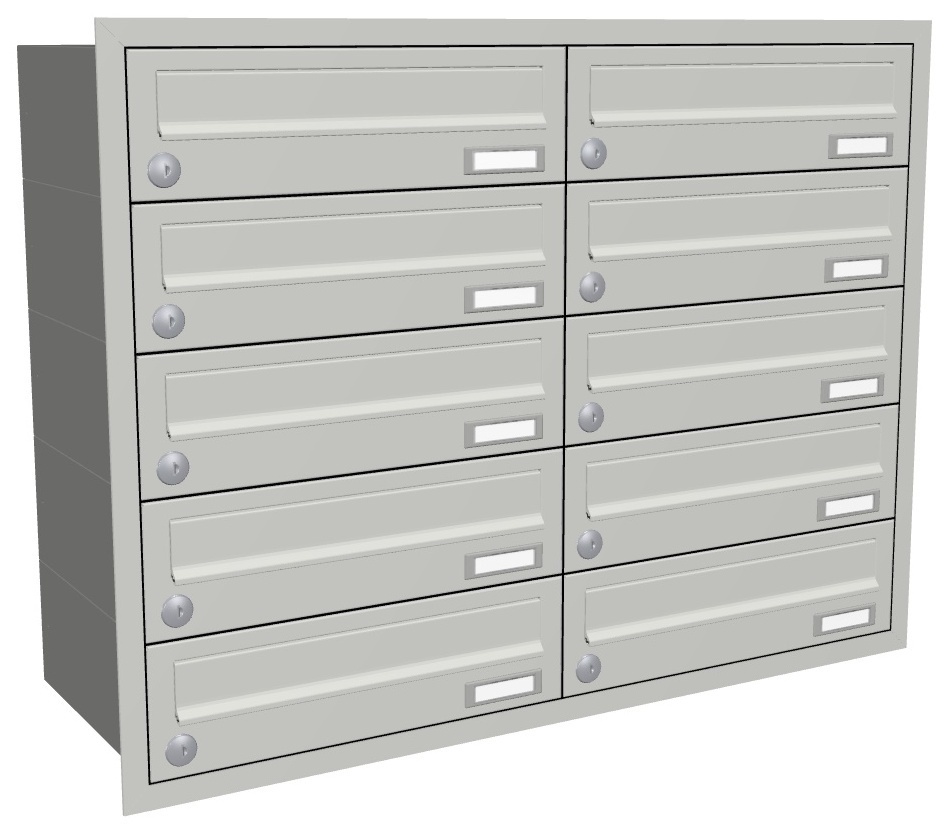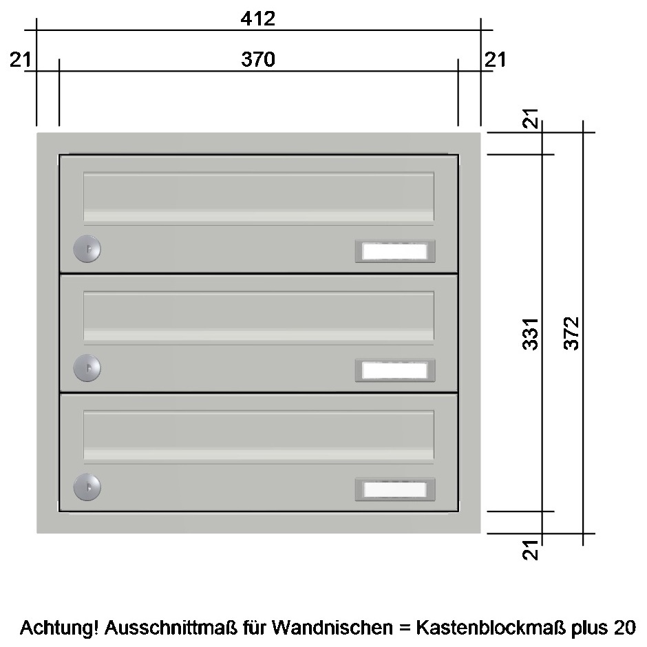 - ausgestattet mit Kunststoff-Namensschild und Edelstahl-verkapptem wasserdichtem Standardschloss mit zwei Schlüsseln; Blindkästen ebenfalls mit Standardschloss (wenn Blindfächer auf Grund der Kastenanzahl notwendig sind)
