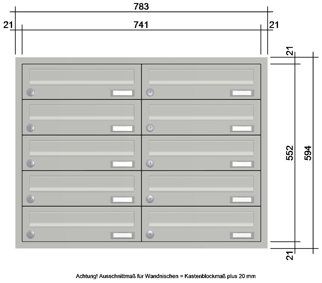 - ausgestattet mit Kunststoff-Namensschild und Edelstahl-verkapptem wasserdichtem Standardschloss mit zwei Schlüsseln; Blindkästen ebenfalls mit Standardschloss (wenn Blindfächer auf Grund der Kastenanzahl notwendig sind)